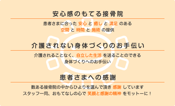 症状を正しく把握するため、いつから・どこが・どんなとき・どうすると・どう辛いのか、等を詳しく伺いながら、丁寧に診察いたします。治療方針は患者さまに合った方法を、解剖図形・模型やパソコンを使ってご説明いたします。一方的な治療はいたしませんので、「嫌だな…」「ちょっと…」と思ったら、遠慮なくご相談ください。もちろん、わからないことや疑問に思っていることなども、お気軽にお尋ねください。