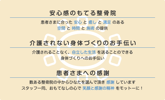症状を正しく把握するため、いつから・どこが・どんなとき・どうすると・どう辛いのか、等を詳しく伺いながら、丁寧に診察いたします。治療方針は患者さまに合った方法を、解剖図形・模型やパソコンを使ってご説明いたします。一方的な治療はいたしませんので、「嫌だな…」「ちょっと…」と思ったら、遠慮なくご相談ください。もちろん、わからないことや疑問に思っていることなども、お気軽にお尋ねください。
